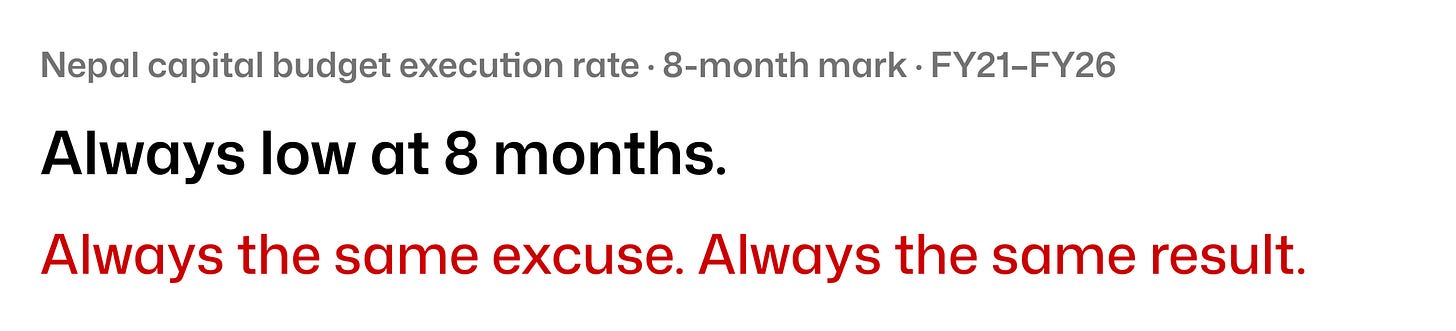 The 19% is not unusually bad by Nepal’s historical standards — FY24 was 18%, FY23 was 15%. What makes it damaging specifically in FY26 is the context: the World Bank just named reconstruction spending as the primary recovery driver for FY27, and reconstruction requires contracts awarded now, project teams mobilised now, and procurement processes started now. If FY26 ends at the historical 50–60% capital execution rate, which it will, because the pattern is identical every year, the reconstruction pipeline entering FY27 will be too thin to drive the 4.4% recovery the World Bank is projecting.