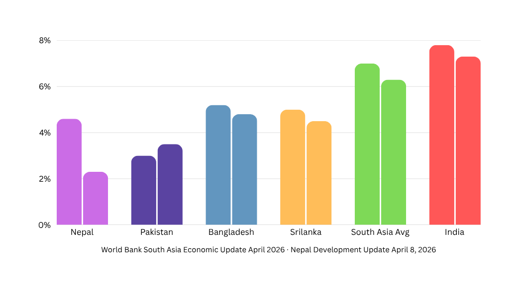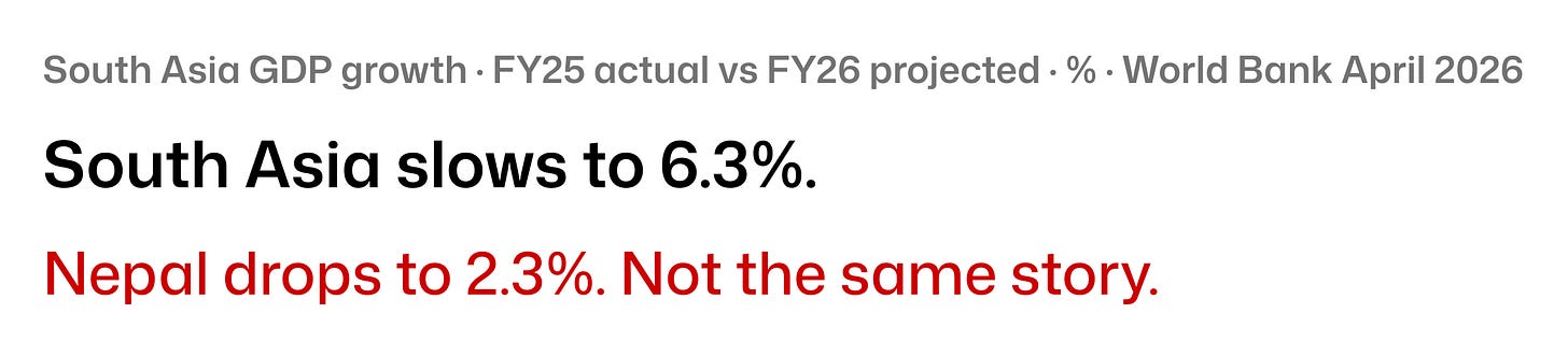 South Asia as a region slows from 7% to 6.3%. Nepal goes from 4.6% to 2.3%. Every country in the region is absorbing the same external shocks, higher fuel prices, Gulf disruption, and aviation uncertainty. Nepal absorbs it hardest because it arrived on top of a domestic shock, because 77.3% of its migrant workers are concentrated in the conflict zone, and because its fuel supply runs entirely through one relationship with one counterparty. The comparison makes the 2.3% harder to dismiss as a normal cyclical slowdown.