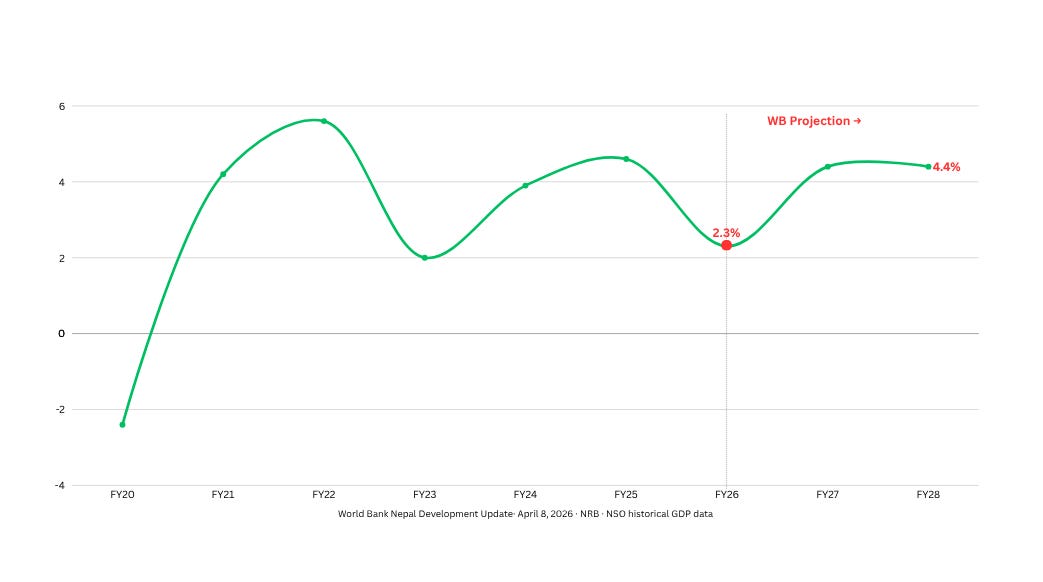 Then on April 8, the World Bank released its Nepal Development Update titled Growth Under Pressure: Navigating Domestic and Global Shocks and cut the full-year FY26 projection to 2.3%. Not a small trim. Half of last year. The steepest single-year deceleration in a decade.