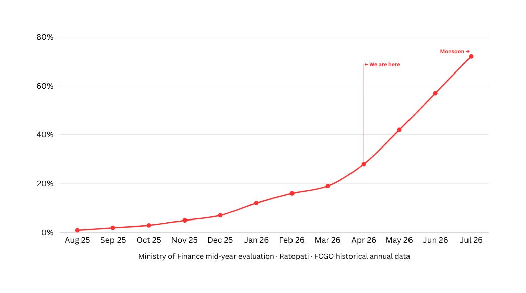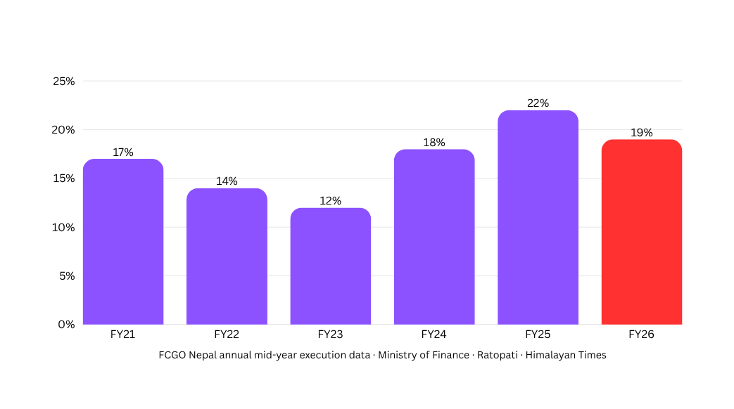 The 19% is not a crisis anomaly. It is precisely where Nepal is every year at this point. The pattern has not improved in five years. What changes is the consequence this year, the World Bank is saying the FY27 recovery depends on exactly the execution Nepal has never managed to improve.