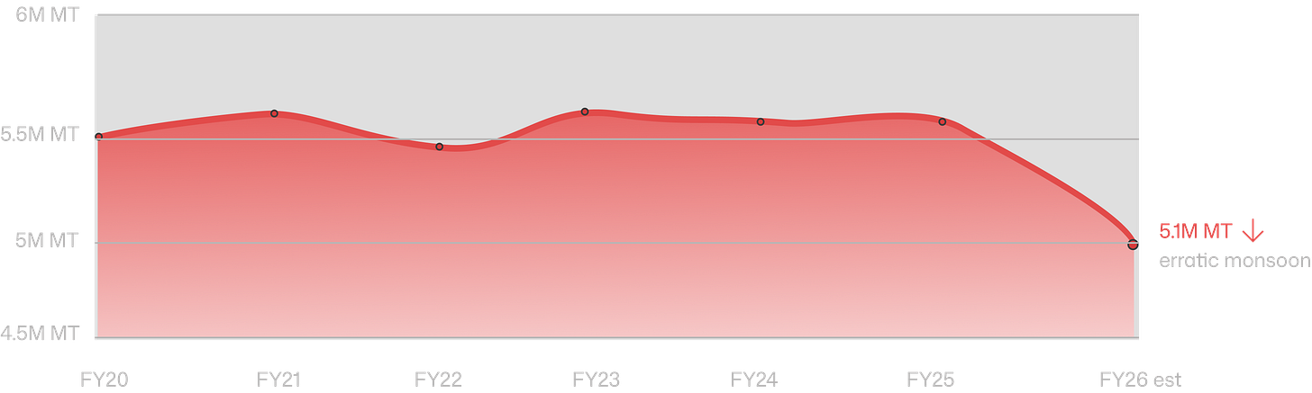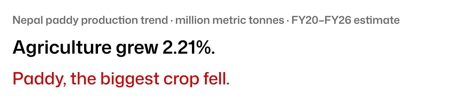 The agriculture headline stayed positive because livestock and vegetables compensated. But paddy, Nepal's defining crop, grown across the Terai, declined due to erratic monsoon and localized drought. Nepal already imports Rs. 28B of rice a year. Domestic production declining means that the import bill grows larger, paid for with remittances from the Gulf corridor that is now at war.