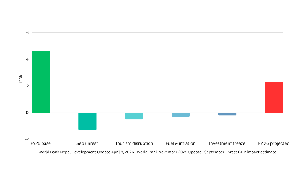 Two shocks arrived before Nepal had recovered from either. First: the September 2025 unrest, which the World Bank estimates cost 1.3% of GDP in direct losses, businesses shuttered, the autumn tourism season eviscerated, and private investment frozen for months while the political situation was resolved. Second: the Strait of Hormuz closing on February 28, crude going to $115, the fuel crisis now costing Nepal Rs. 627 million every day. The World Bank is not projecting a catastrophe. It is doing arithmetic on an economy hit twice.