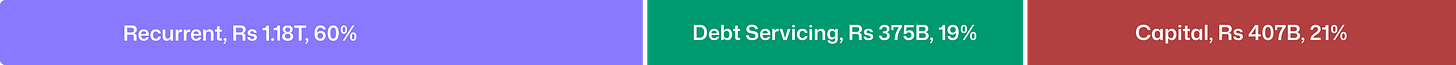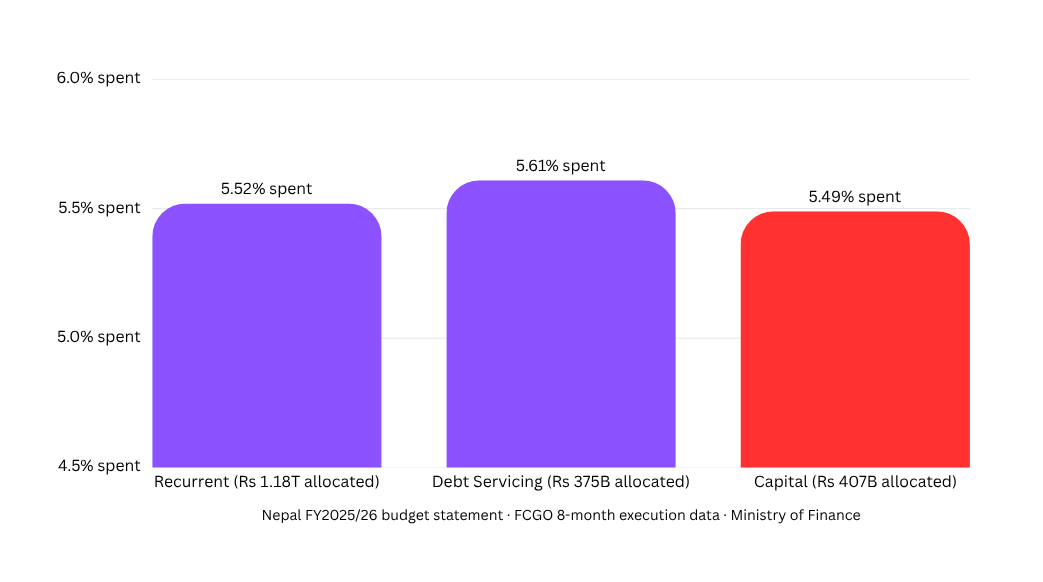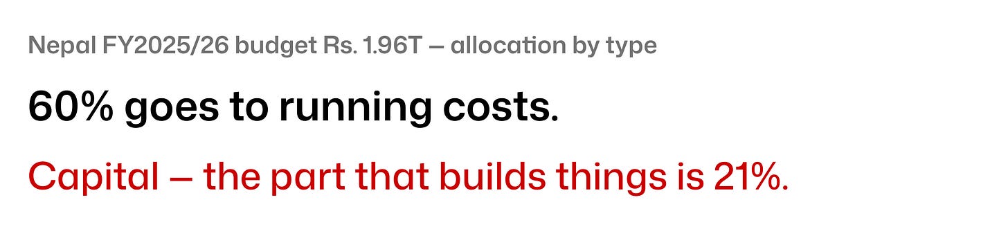 Out of Nepal's Rs. 1.96 trillion budget, Rs. 1.18 trillion is recurrent expenditure, salaries, admin, operations. Rs. 375B is debt servicing. Only Rs. 407B, 21% is capital. That is the portion that builds roads, schools, and hospitals. And at 8 months in, only 19% of it has been spent.