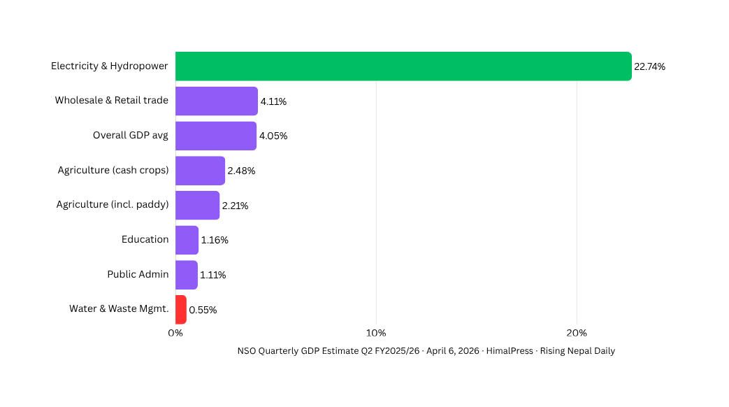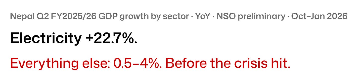 One number stands apart. The electricity, gas, and air conditioning sector, which essentially drives Nepal’s hydropower buildout, expressed itself in GDP data, grew 22.74% year-on-year. Real megawatts from real dams that took a decade to build. Everything else in the economy grew between 0.55% and 4.11%. When a 22.74% gain in a relatively small sector produces a 4.05% aggregate, the arithmetic means the rest of the economy was growing at roughly 2–3%. That is the pre-crisis number. Q3, which covers February through April, the entire fuel crisis, three price hikes, and the peak tourism disruption, will be worse.