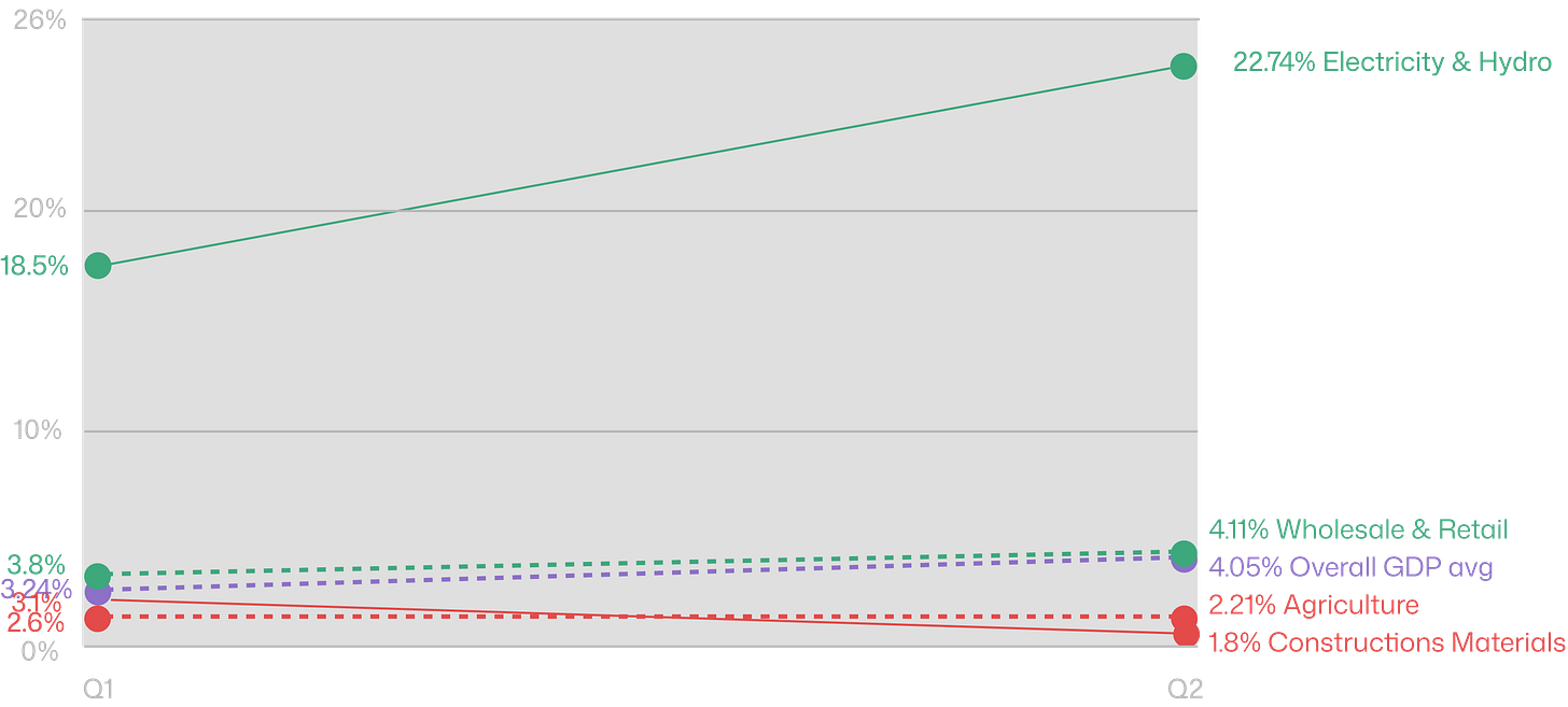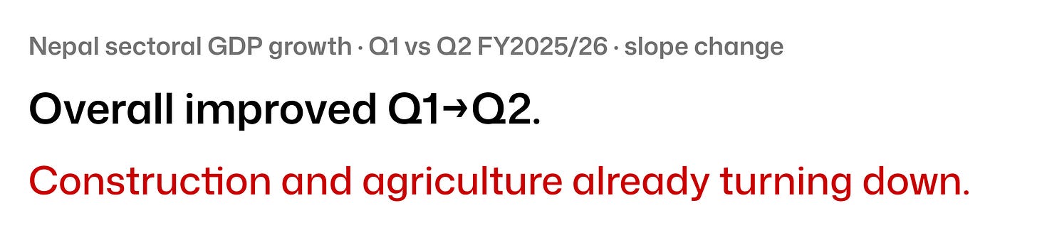 The electricity number is real; Nepal has been building hydropower for twenty years, and the output is finally visible in GDP data. But hydropower is not yet large enough as a share of total GDP to carry the headline number without the rest of the economy's cooperation. The split between Q1 and Q2 within this data also tells a more granular story: which sectors accelerated between Q1 and Q2, and which ones were already slowing before the second shock arrived.