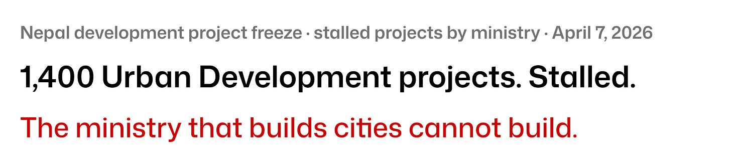 The government froze Rs. 58.168 billion from the development ministry budgets this week. Not the first freeze, Rs. 119 billion was suspended after September. Only Rs. 52.9 billion of that has been released. The Ministry of Urban Development still has 1,400 projects stalled. This week’s Rs. 58B freeze is additive to that backlog. Infrastructure projects are not just underfunded in Nepal; they are actively being paused mid-cycle while the government simultaneously tells the World Bank it plans to use reconstruction spending as the primary recovery driver for FY27.