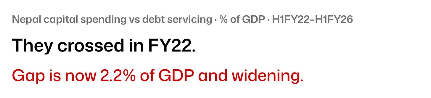 Nepal borrowed to build infrastructure. The repayments have started. Capital spending has been falling every year as fiscal space tightens. September 2025 widened the gap sharply, capital spending collapsed, while debt obligations stayed fixed. The country is now paying more for past projects than it is investing in new ones.