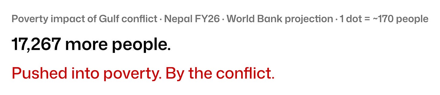 These are households in rural Nepal whose income flows almost entirely from a family member working in Saudi Arabia or the UAE. Their cost of living is rising because fuel price hikes flow through to food and transport. They have no social protection buffer. The World Bank notes: "Slower growth, higher inflation, and a sharp decline in remittances, especially in rural areas, will weigh on household incomes." This is not macroeconomics. This is whether families can afford to eat.