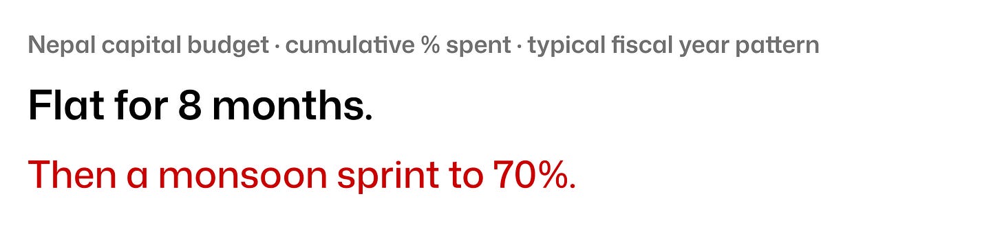 This is not this year's chart. It is every year's chart. Nepal consistently sits at 12–22% at 8 months, then spends half the budget in the final two months, during the monsoon. Roads built in June wash out in August. Bridges rush-contracted in March get finished in the rain. The infrastructure degrades faster than it should. The repair budget competes with next year's allocation.