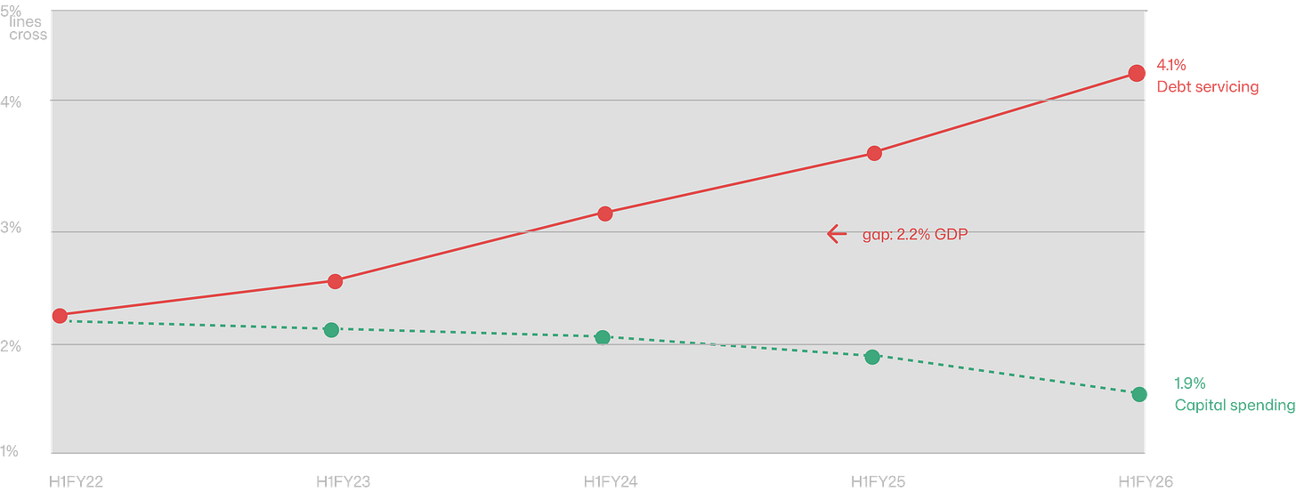 But the freeze headline almost distracts from the structural number the World Bank quantified for the first time explicitly in the April 8 report: Nepal’s debt servicing now exceeds its capital expenditure. The gap reached 2.2% of GDP in H1FY26 and has been widening every year since H1FY22. Nepal is paying more to service old borrowing than it is spending to build new things. In a country with one of the largest infrastructure deficits in South Asia, that inversion makes every other development problem harder.