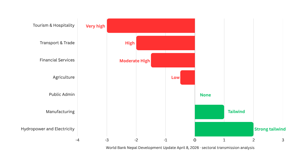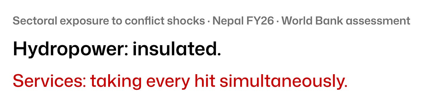 Services is Nepal's largest GDP contributor and the sector most exposed to every transmission channel, simultaneously fuel costs, aviation disruption, tourism decline in peak season, and remittance-dependent household spending drying up. Hydropower runs on water, not imported petroleum. The divergence is not accidental.
