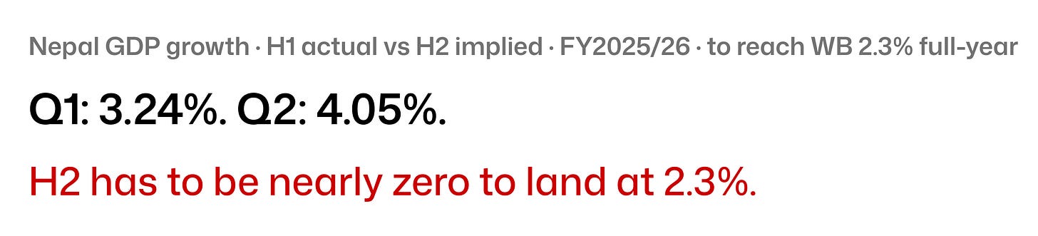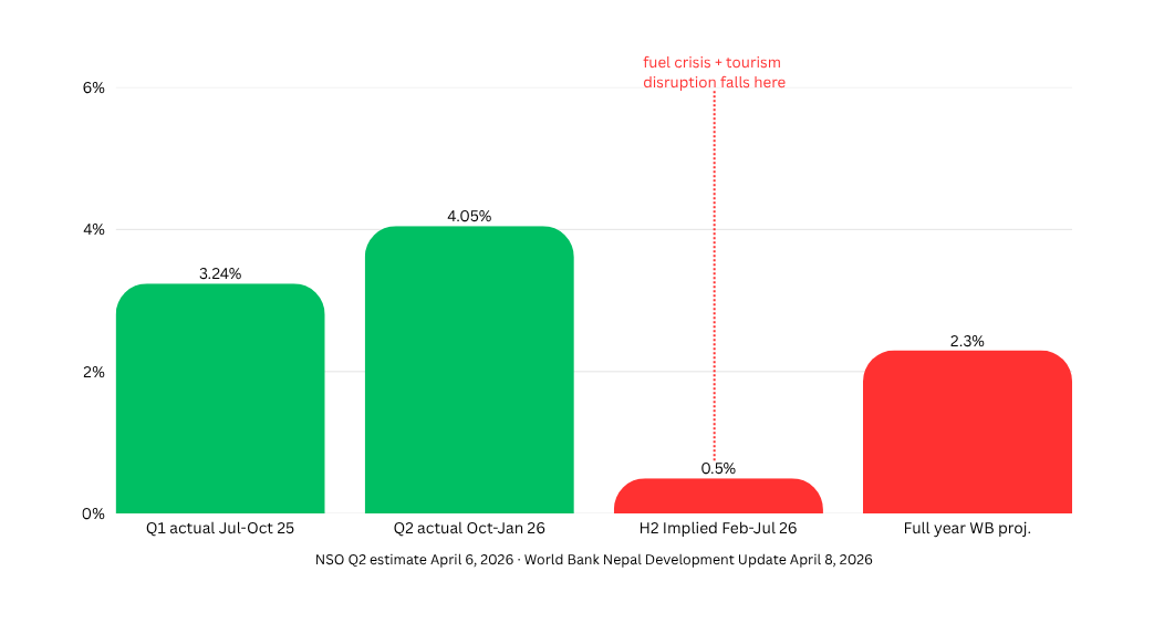 Three data drops this week. Three different institutions. The World Bank’s 2.3% is the aggregate verdict of two simultaneous shocks hitting an economy with limited buffers. The NSO’s Q2 data shows what the economy looked like before the second shock arrived, already K-shaped, already slowing in the physical sectors that employ most people, paddy declining before the fuel crisis added further pressure. And the capital budget number shows why the recovery the World Bank is projecting for FY27 is not guaranteed: Nepal has consistently failed to execute the infrastructure spending that recovery requires, debt servicing is now crowding out the new investment that would break the cycle, and the government’s response this week was to tell its secretaries to carpool.