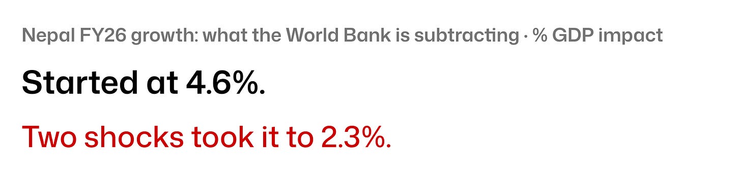 The World Bank is not guessing. It is subtracting. September unrest: −1.3% of GDP in direct losses, disrupted tourism, frozen investment. Middle East conflict: services down, fuel up, remittances at risk, aviation disrupted. What remains after both shocks is 2.3%.