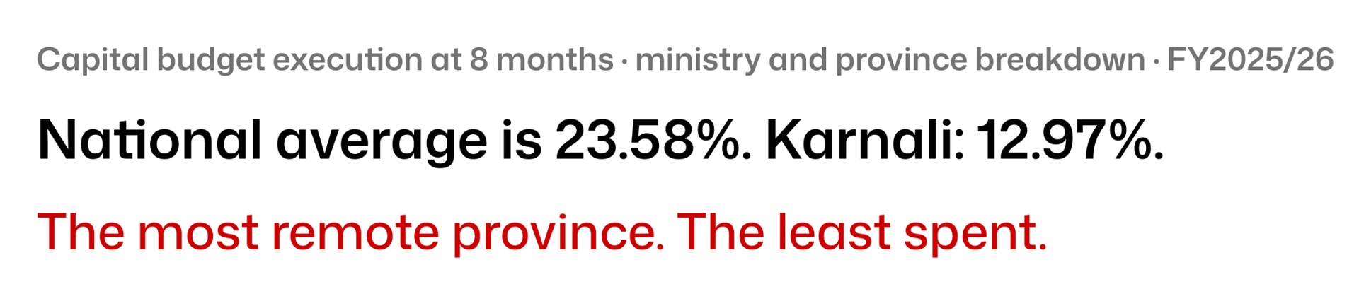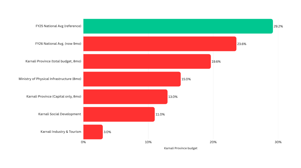 The national number flatters what is happening at the provincial and ministry level. The Ministry of Physical Infrastructure responsible for building Nepal's roads, bridges, and water systems has spent 15% in 8 months. Karnali's Industry and Tourism ministry: 3%. These are the institutions most responsible for closing Nepal's infrastructure gap.