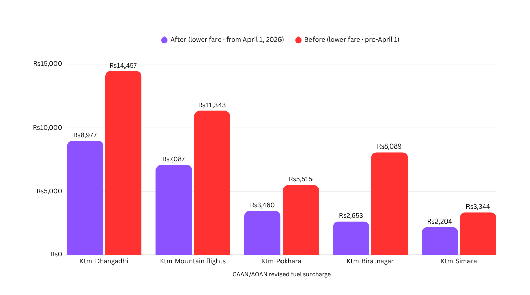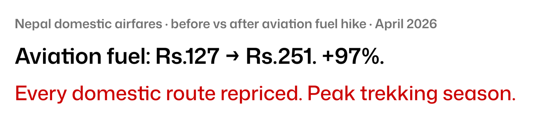 Aviation fuel in Nepal went from Rs.127 to Rs.251 per litre in six weeks, a 97% increase. That is not a rounding error. The Civil Aviation Authority adjusted domestic fares on every route the moment NOC raised aviation fuel prices. Kathmandu to Dhangadhi: Rs.11,090, up Rs.5,480. Mountain flights: up Rs.4,225.