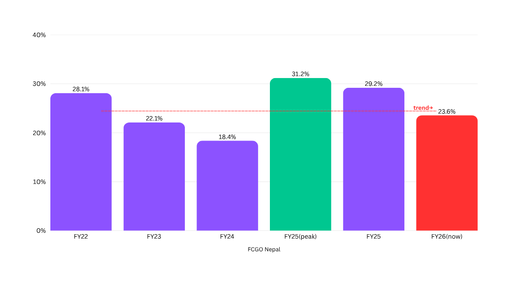 The trend line through these points is going down, not sideways. Nepal is not just consistently behind, it is falling further behind each year. FY26 was supposed to be the year reconstruction spending kicked in. Instead it set a five-year low at the 9-month mark.