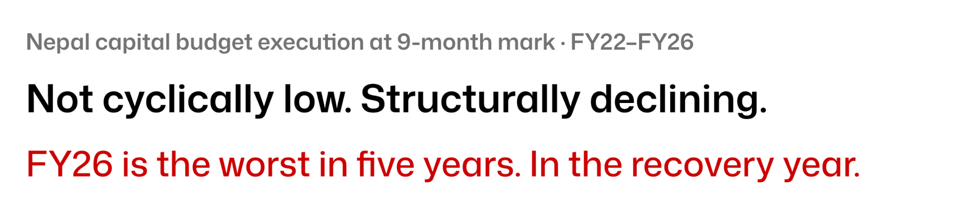 The trend line is the point. This is not a bad year on top of a stable baseline. The baseline itself is declining. Nepal has been executing less of its capital budget at the 9-month mark every year. The FY25 reading of 29.2% was itself below FY22's 28.1%. FY26 at 23.58% is another leg down. The recovery of the World Bank models assumes reconstruction spending driving FY27 growth but reconstruction requires contracts awarded now, projects tendered now, works started now. If the year ends at 23.58%, the pipeline entering FY27 is thinner than any year before it.