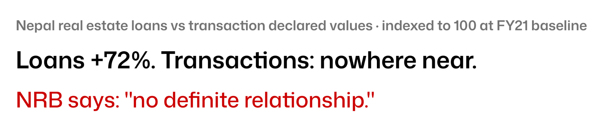 This is the NRB saying, carefully, that Nepal's banks have been lending into real estate without a corresponding rise in actual market activity. Loans grew 72% from FY21 to FY25. Declared transaction values, while recovering, have not kept pace. The gap is collateral you cannot easily liquidate.