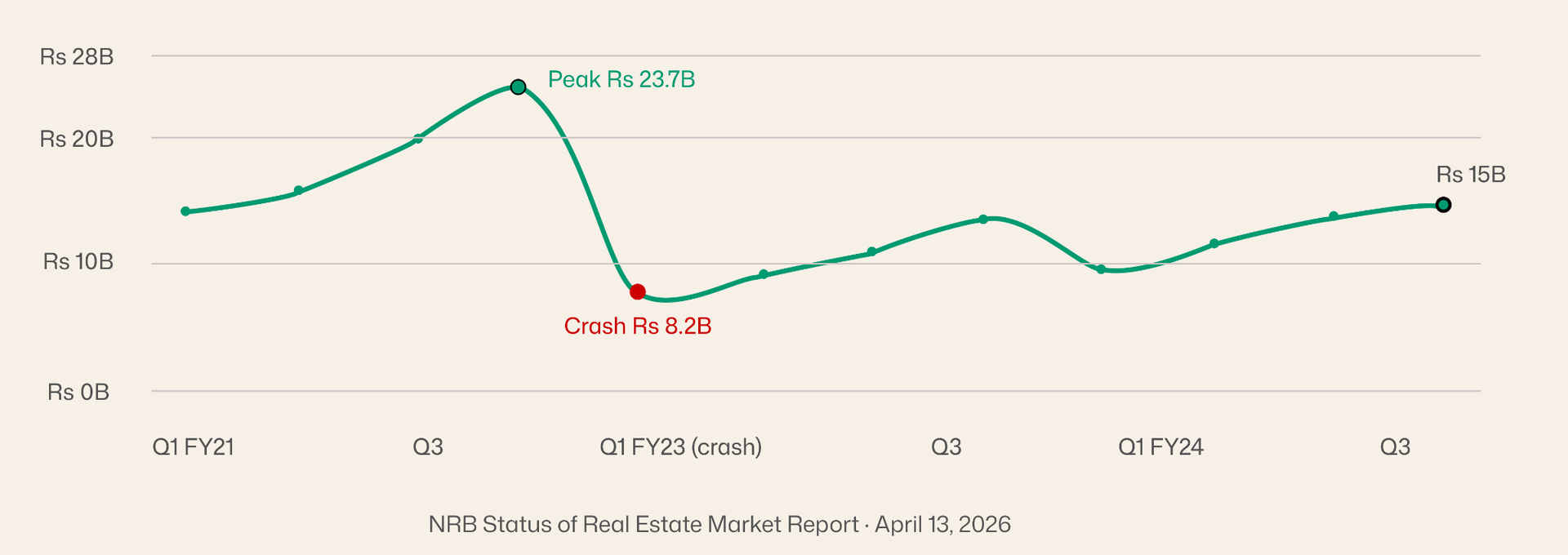 The 2022/23 crash was not noise. It was the cooperative sector collapse, the interest rate spike, and the land-splitting ban landing simultaneously. The recovery since is real but the market that generated Rs.23.7B in a single quarter has not returned.