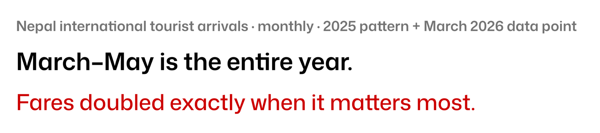 Nepal's tourism is not spread evenly. Spring (Mar–May) and autumn (Oct–Nov) account for roughly 60% of annual arrivals, spring alone is 30%+. A demand shock during these 10 weeks does not just affect this month's revenue. It sets the GDP trajectory for the quarter. March 2026 came in at 120,516 arrivals. April and May data will tell the full story.