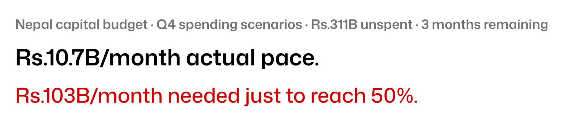 The first 9 months averaged Rs.10.7 billion per month. To reach any respectable full-year execution rate, Q4 needs to run at a pace Nepal has never historically achieved and this year, construction is at 15–20% capacity.