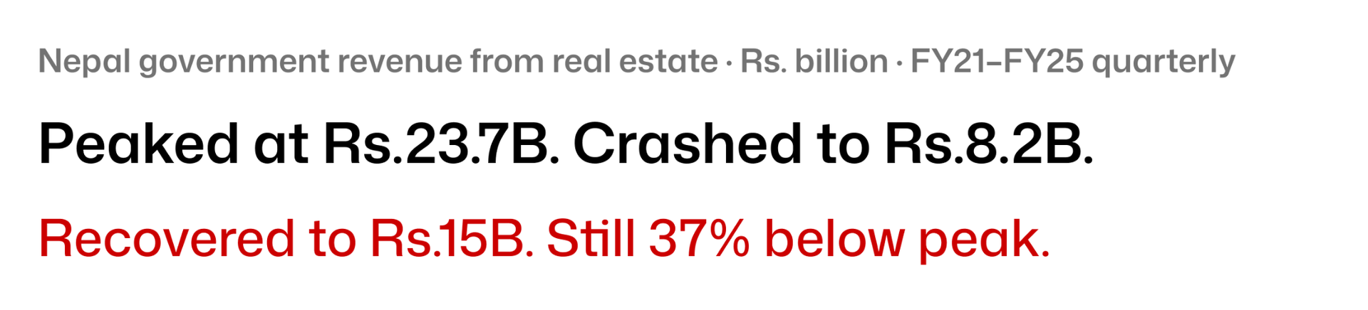 The NRB is publishing this data quarterly going forward. The timing is significant: the first report lands in a week when real estate transactions hit a three-year high and NRB simultaneously has Rs.2 trillion sitting idle in the banking system with 4.4% credit growth. The implication of the report does not state explicitly: if that idle liquidity starts moving into real estate, the only asset class with momentum, loan growth and transaction decoupling could widen further. Nepal has done this cycle before. It ended in 2022/23 with a crash to Rs.8.2 billion revenue. The difference this time is that the NRB will have data to see it coming quarterly rather than discovering the damage in hindsight.