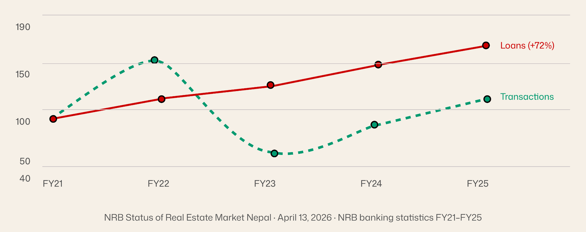 But the NRB buried a more interesting finding in the report: credit growth and transaction activity are decoupled. Loans grew 72.41% over five years. That did not consistently translate into higher declared transaction values or land prices. The central bank says explicitly: "no definite relationship." Nepal has been lending aggressively into real estate without a proportionate increase in actual market activity. The loans went somewhere, they just did not go where the transactions were.
