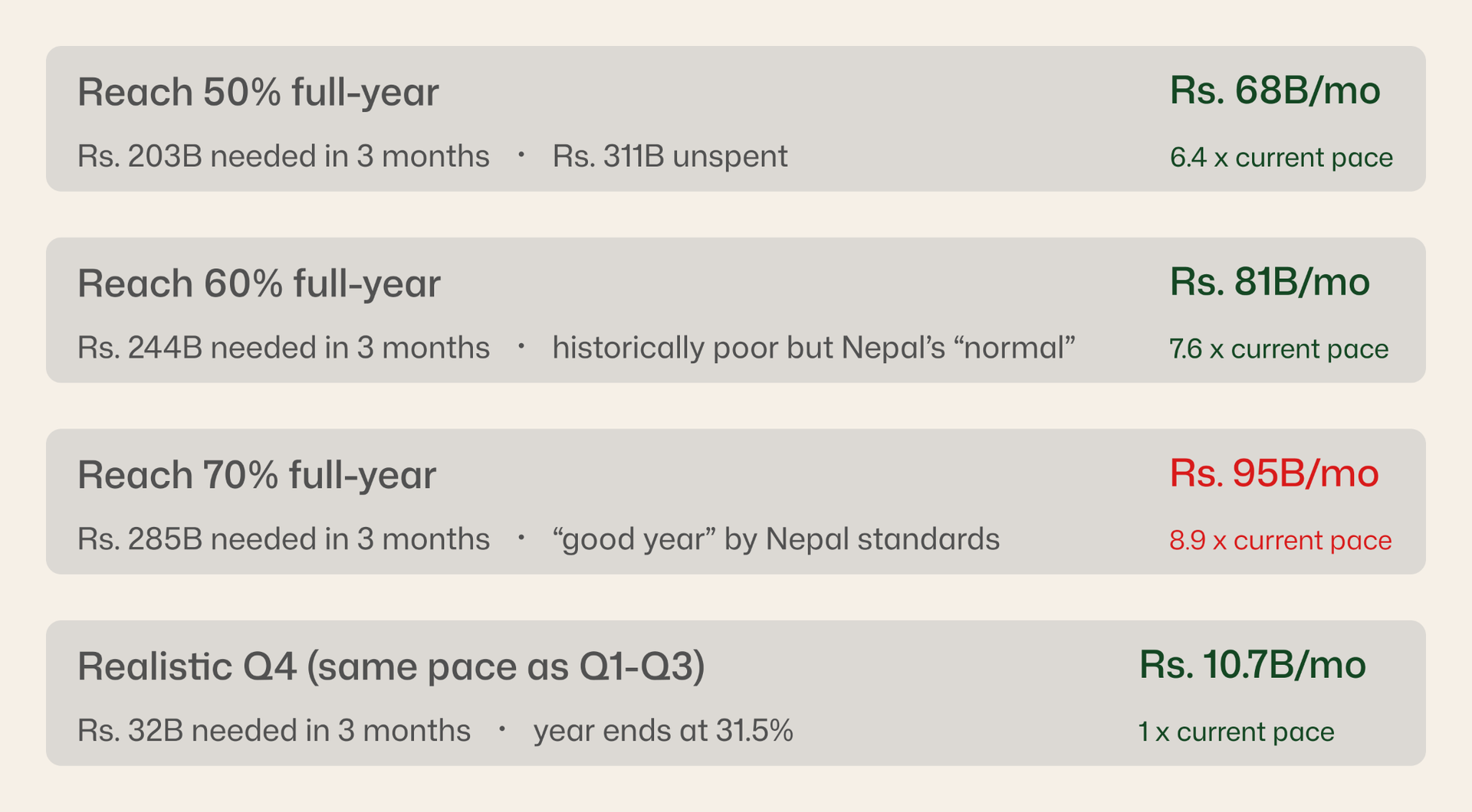 Even reaching a historically mediocre 60% execution rate requires spending 7.6× the current monthly pace for three consecutive months during the monsoon. Nepal's typical monsoon sprint pushes execution to 50–60% by year end but this year, with construction at 15–20% capacity and contractors refusing to work at current material prices, the sprint is impaired before it starts.