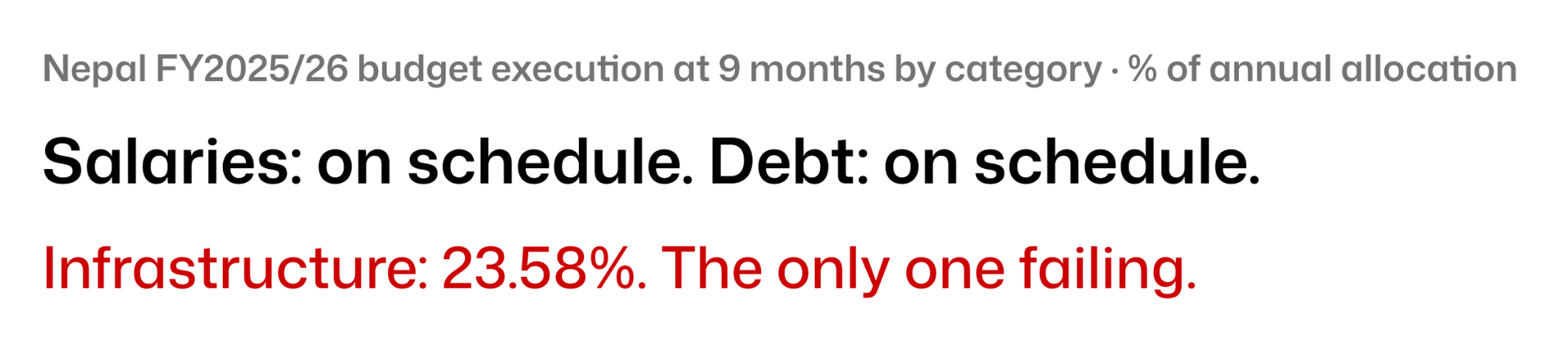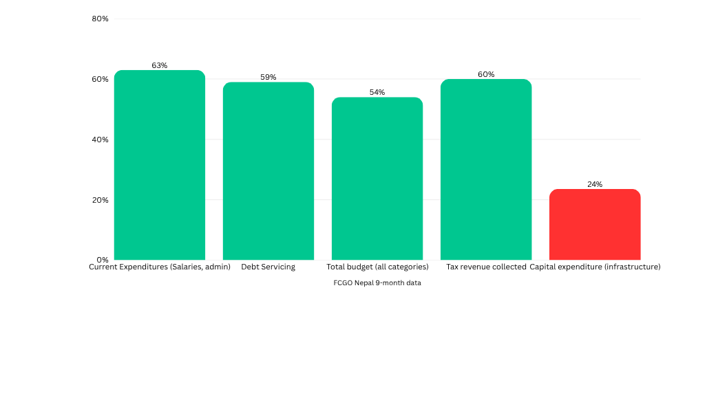 This is not a normal year of underperformance. This is the year Nepal's new majority government, the first clean mandate in over a decade, said reconstruction and infrastructure investment would drive the recovery that the World Bank is projecting at 2.3% GDP growth. The FCGO released the 9-month data this week. Rs.96.19 billion spent of Rs.407 billion allocated. That is 23.58%.