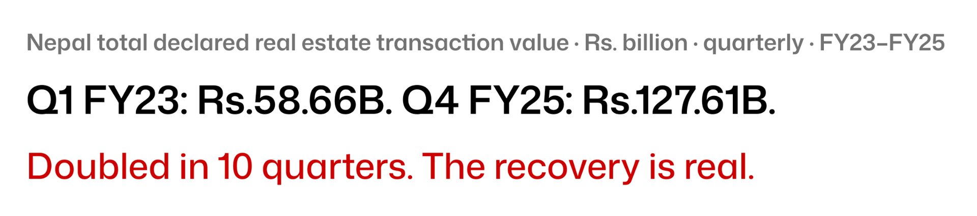 The recovery to Rs.15 billion is real, but the line asking to be examined is not the absolute level, it is the slope. Transaction value went from Rs.58.66 billion in Q1 FY23 to Rs.127.61 billion in Q4 FY25. That is a clean doubling in under three years. Government revenue did not double alongside it. That gap means declared values are rising faster than government revenue is capturing which in Nepal usually means underreporting is back. When the market was depressed, buyers declared closer to actual value because they were cautious. As confidence returned, the gap between declared price and actual price widened again.