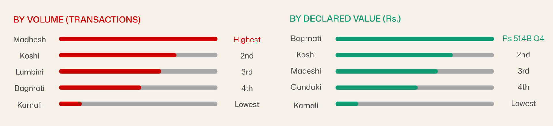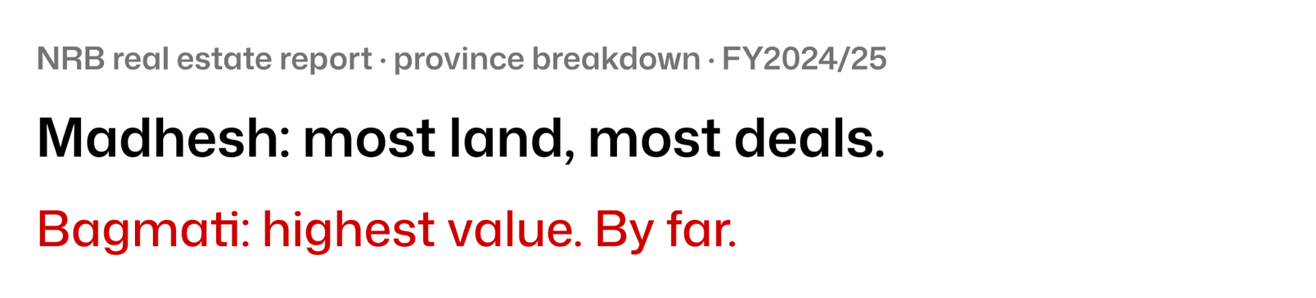 The regional split is where the NRB report gets genuinely interesting. Madhesh Province leads in transaction volume and physical area. Bagmati leads in declared value, by a large margin. Metro areas account for just 4.1% of all transactions nationwide but 13% of all declared value.