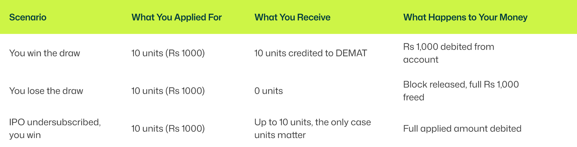 If you apply for 100 units instead of 10, you do not improve your probability of winning the draw. The computerised random selection treats every valid application as one entry regardless of how many units were requested. One DEMAT account, one draw entry.