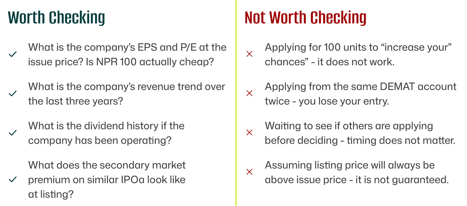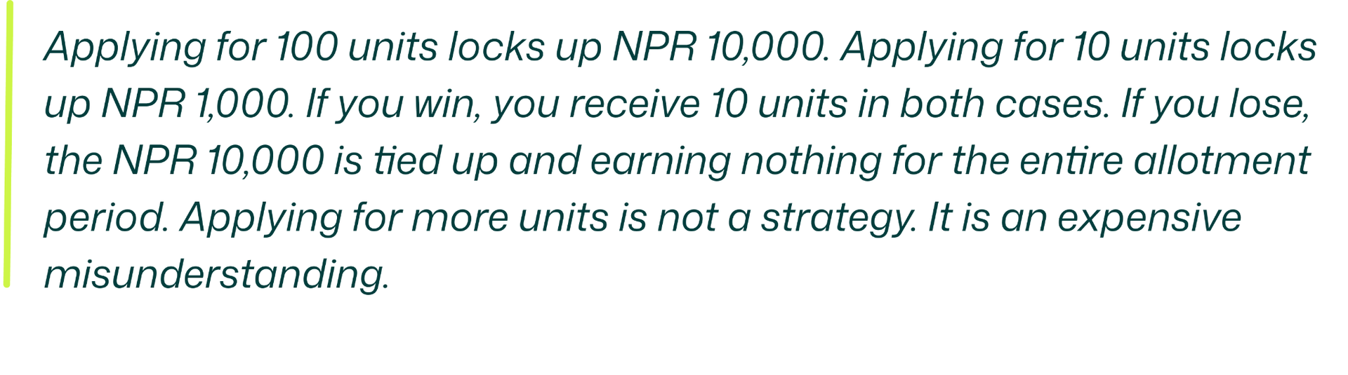 There is one exception to this. If the IPO is undersubscribed, with fewer applications than shares available, the allotment formula changes. In that case, applicants may receive more than the minimum 10 units, and the number of units you applied for does become relevant. But undersubscription is rare for reasonably priced IPOs in Nepal. If it happens, it usually signals something worth understanding about the company before you celebrate getting extra shares.