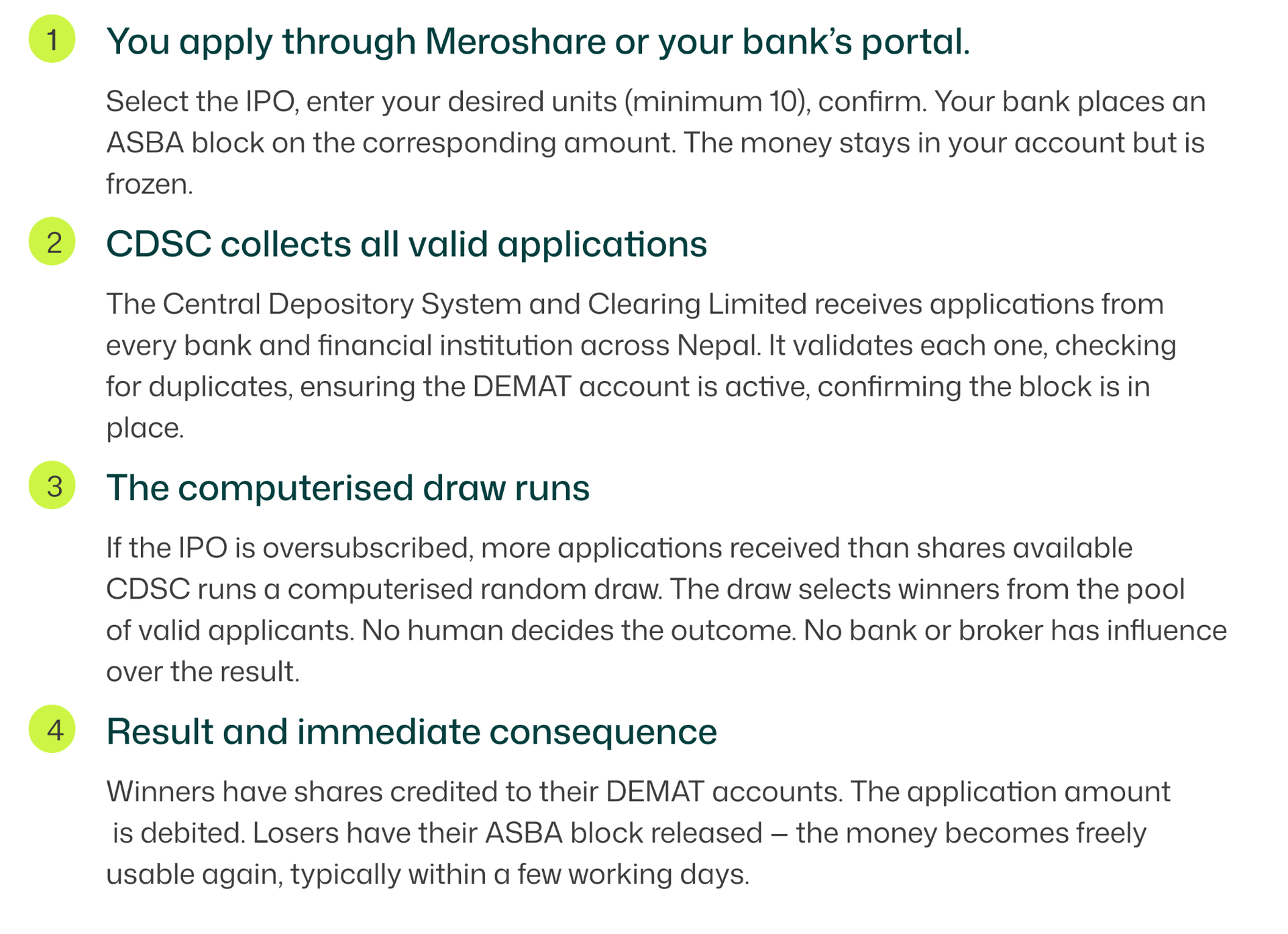 This is not a flaw. It is how every public market handles the gap between supply and demand when a company first lists. In Nepal, the system that manages this draw is called ASBA and the institution that runs the allotment is CDSC(Central Depository Service and Clearing Ltd.).