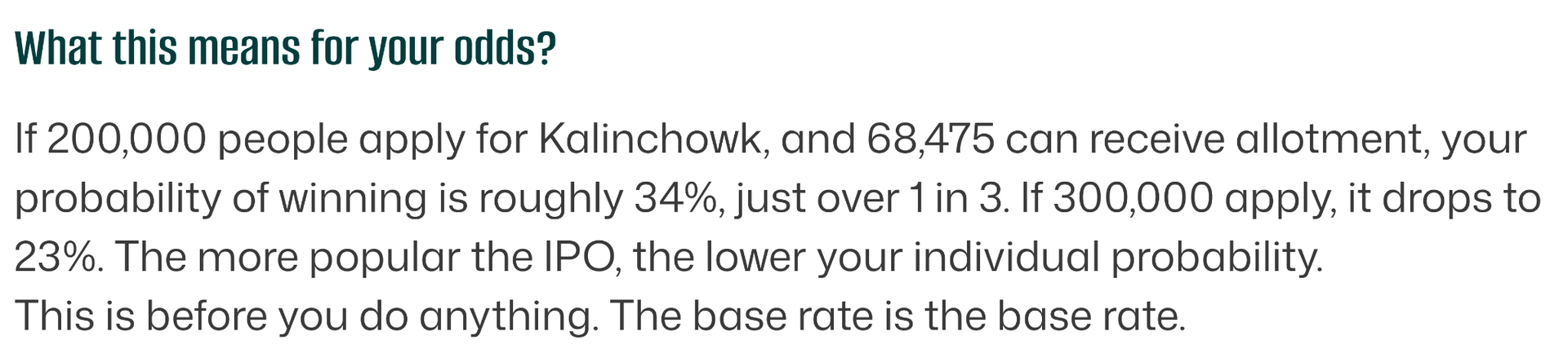 For Kalinchowk: 6,84,750 shares available. If 200,000 valid applications are received, the formula gives approximately 3.42 shares per applicant on average, which rounds to 0 in lot terms. This means not every applicant can receive shares. The draw picks 68,475 of them randomly, each receiving 10 units.