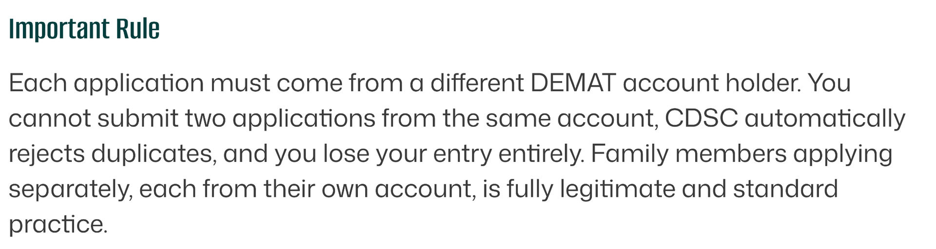 If you and your spouse both have active DEMAT accounts, you can each apply independently. That is two entries in the draw. If your parents or adult children also have accounts, they can apply too. Each valid, independent application from a separate DEMAT account is a separate draw entry.