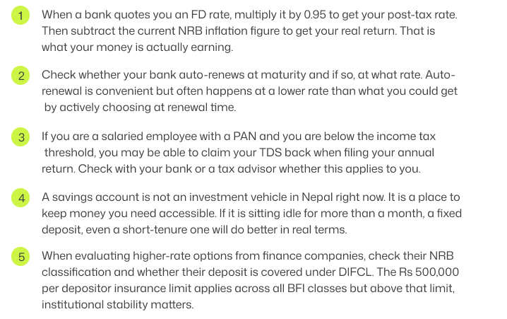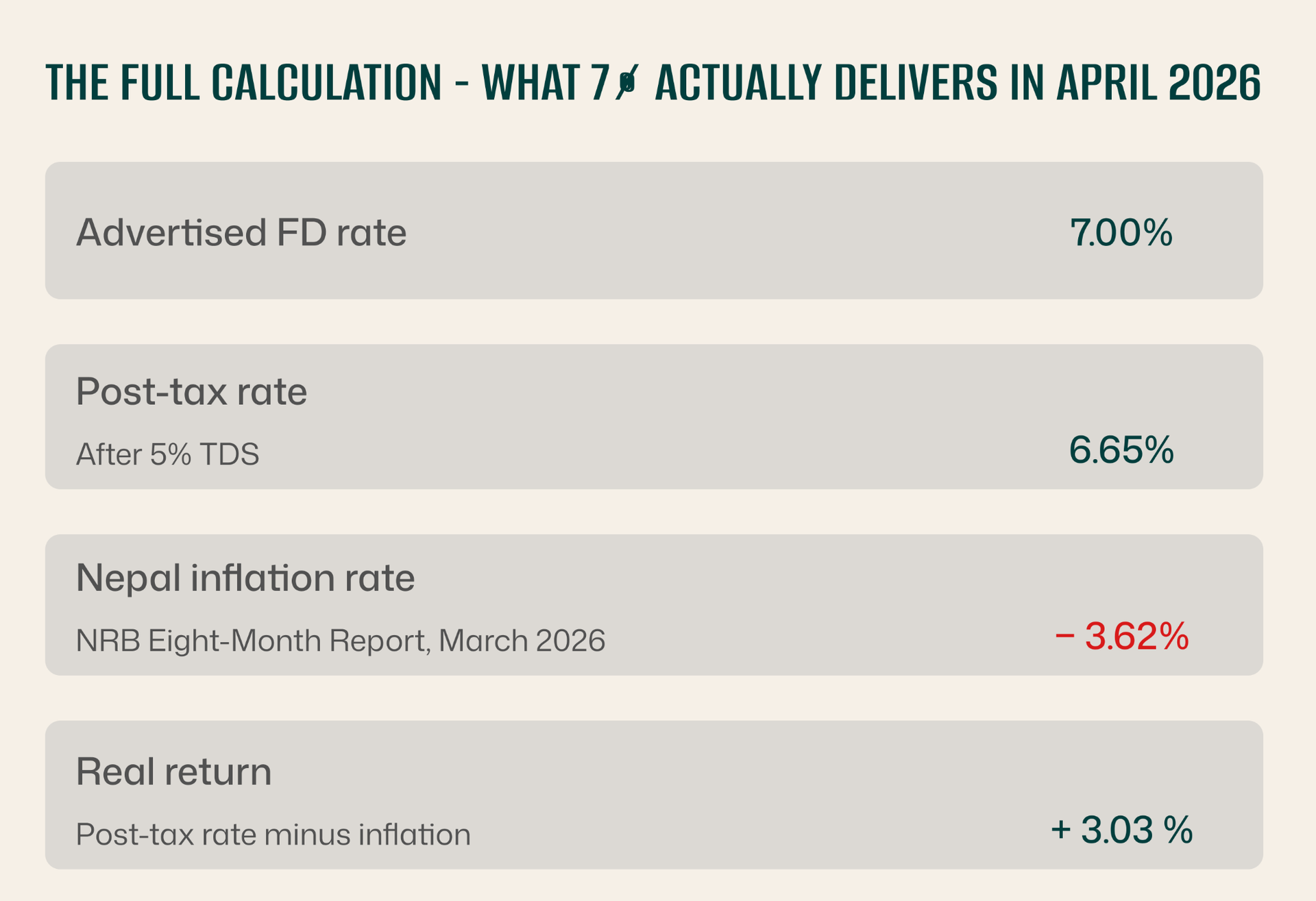 Walk into any commercial bank in Nepal right now and ask about a fixed deposit. The person across the counter will tell you a number between 6% and 8%, depending on the tenure. It sounds straightforward. You deposit Rs 100,000, you earn Rs 7,000 in a year, you walk out better off. That is how most people understand it. It is also not the complete picture, because that 7% is the rate before two things happen to it. The first is a tax. The second is inflation. After both, the number you actually keep is different from the number on the banner.