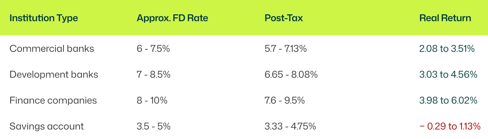 Not all deposits earn the same rate. The type of institution matters, Commercial banks are regulated more tightly and generally offer lower rates than development banks or finance companies. Here is how the real return picture looks across the landscape as of April 2026, at the current inflation rate of 3.62%.