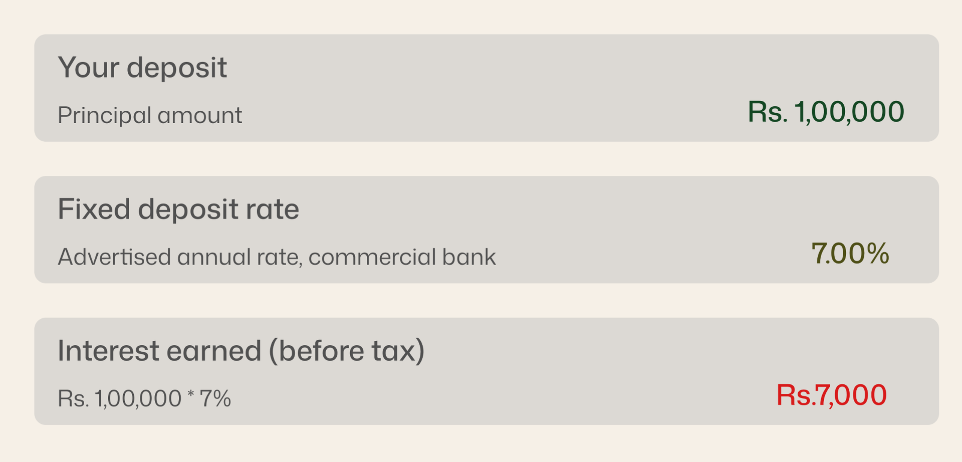 For this calculation we will use 7% per annum, a reasonable midpoint for a one-year fixed deposit at a commercial bank today. The deposit amount is Rs 100,000, because round numbers make the math legible.