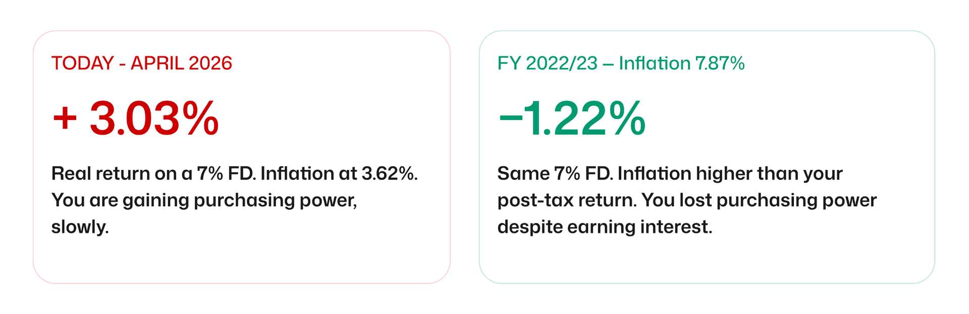 At the current inflation rate of 3.62%, a 7% fixed deposit gives you a real return of approximately 3.03%. Your money grew in purchasing power terms but by 3%, not 7%.