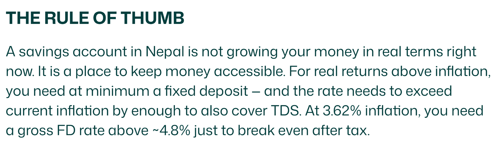 Your Rs 6,650 in post-tax interest exists in a world where prices are also moving. If prices rise by 3.62% this year which is Nepal's current inflation rate according to the NRB's April 2026 report, then the purchasing power of your money has declined by 3.62%, even as your balance increased by 6.65%.