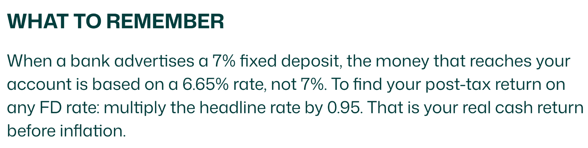 Your 7% fixed deposit is now earning 6.65% in your hands. The Rs 350 is gone, automatically, quietly, before you see the credit. This is not a complaint about the tax system. It is just the first number that needs to be in your calculation when you compare FD returns to anything else.