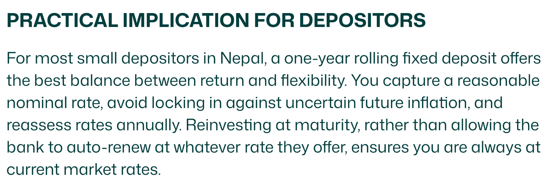 One natural response to low real returns is to extend the tenure, lock the money away for longer, earn a higher rate, and let compounding work. In Nepal, fixed deposits are typically offered in tenures from three months to three years, with longer tenures generally earning higher rates. But two things complicate the compounding story here.