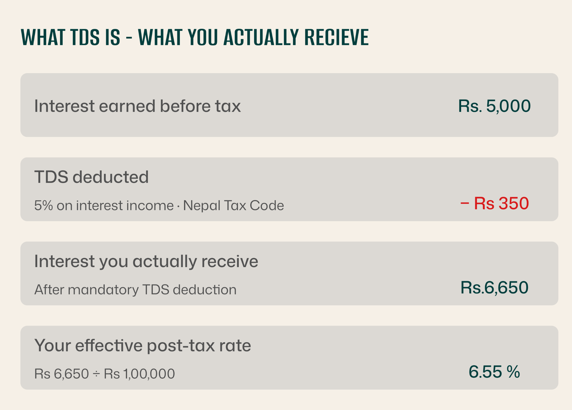 Nepal levies Tax Deducted at Source(TDS) on fixed deposit interest. The current rate is 5% for individual depositors. The bank deducts this automatically before crediting your interest. You do not write a cheque. You do not file a separate return for it. It simply disappears before the money reaches you.
